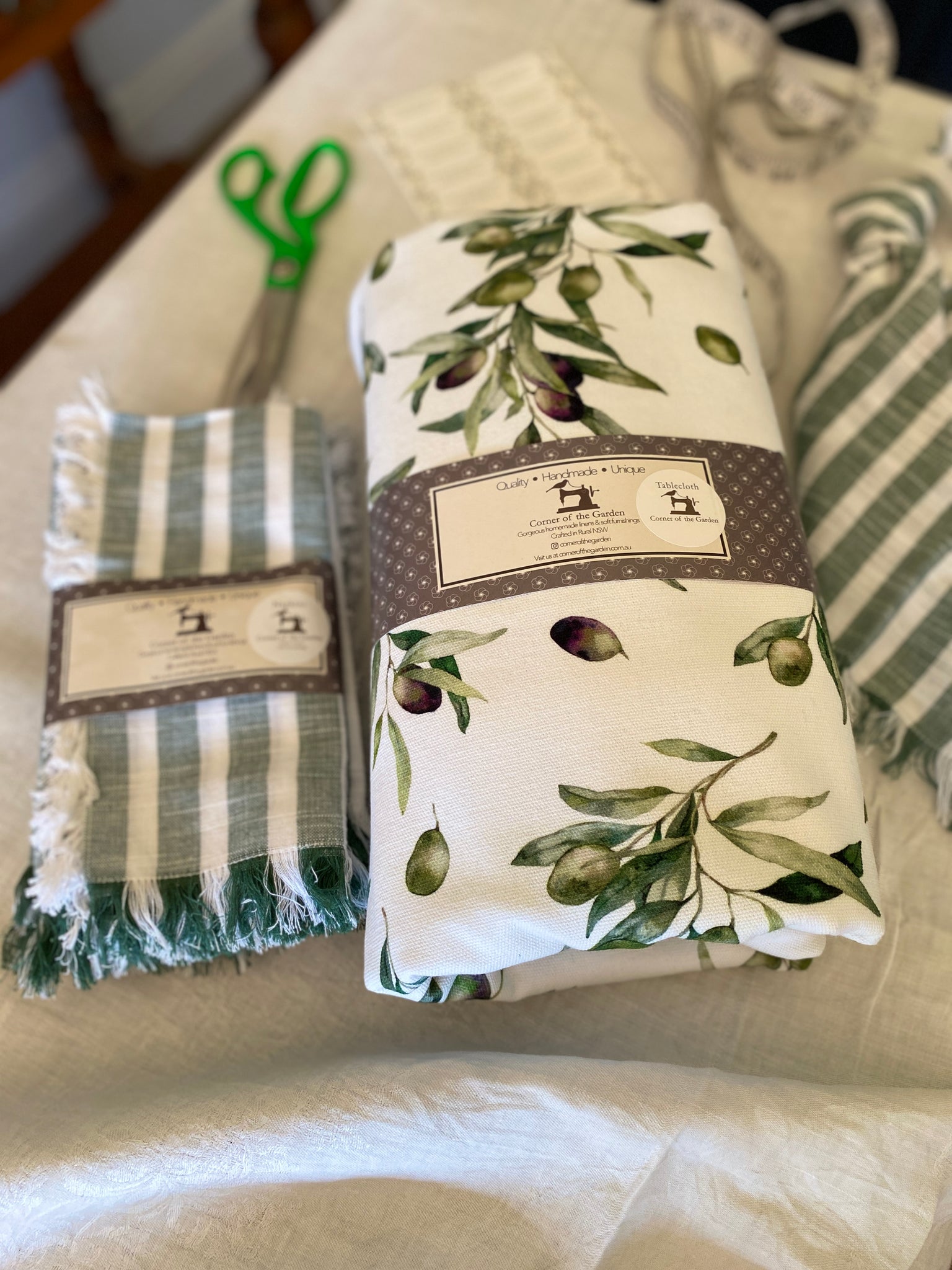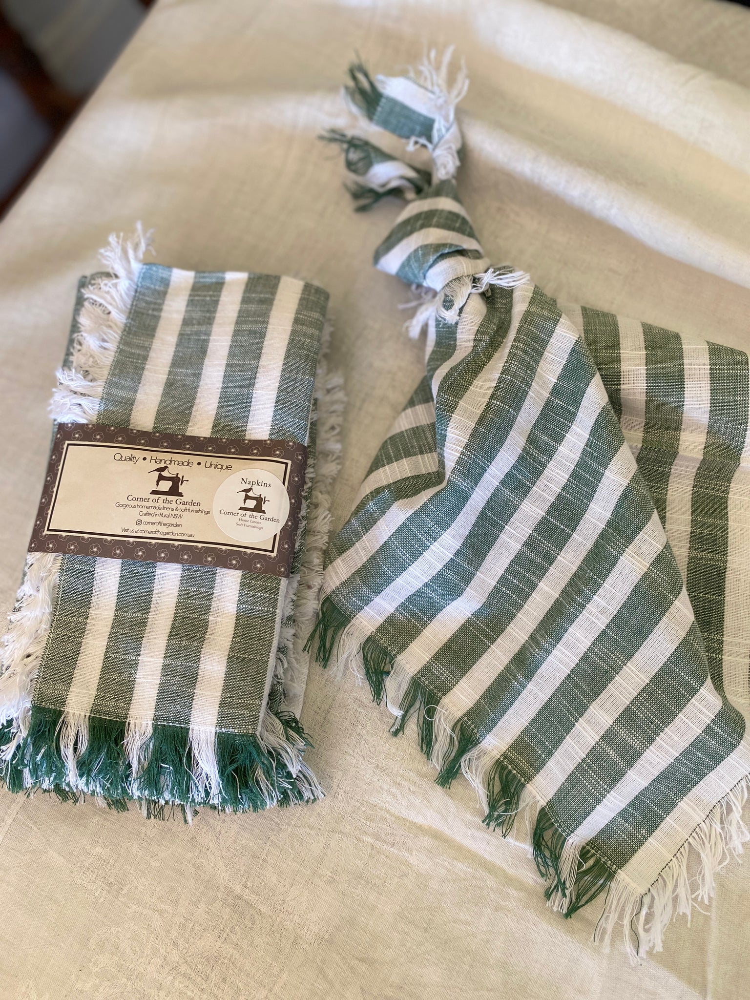 Gorgeous fringed Cotton Green Stripe napkins.