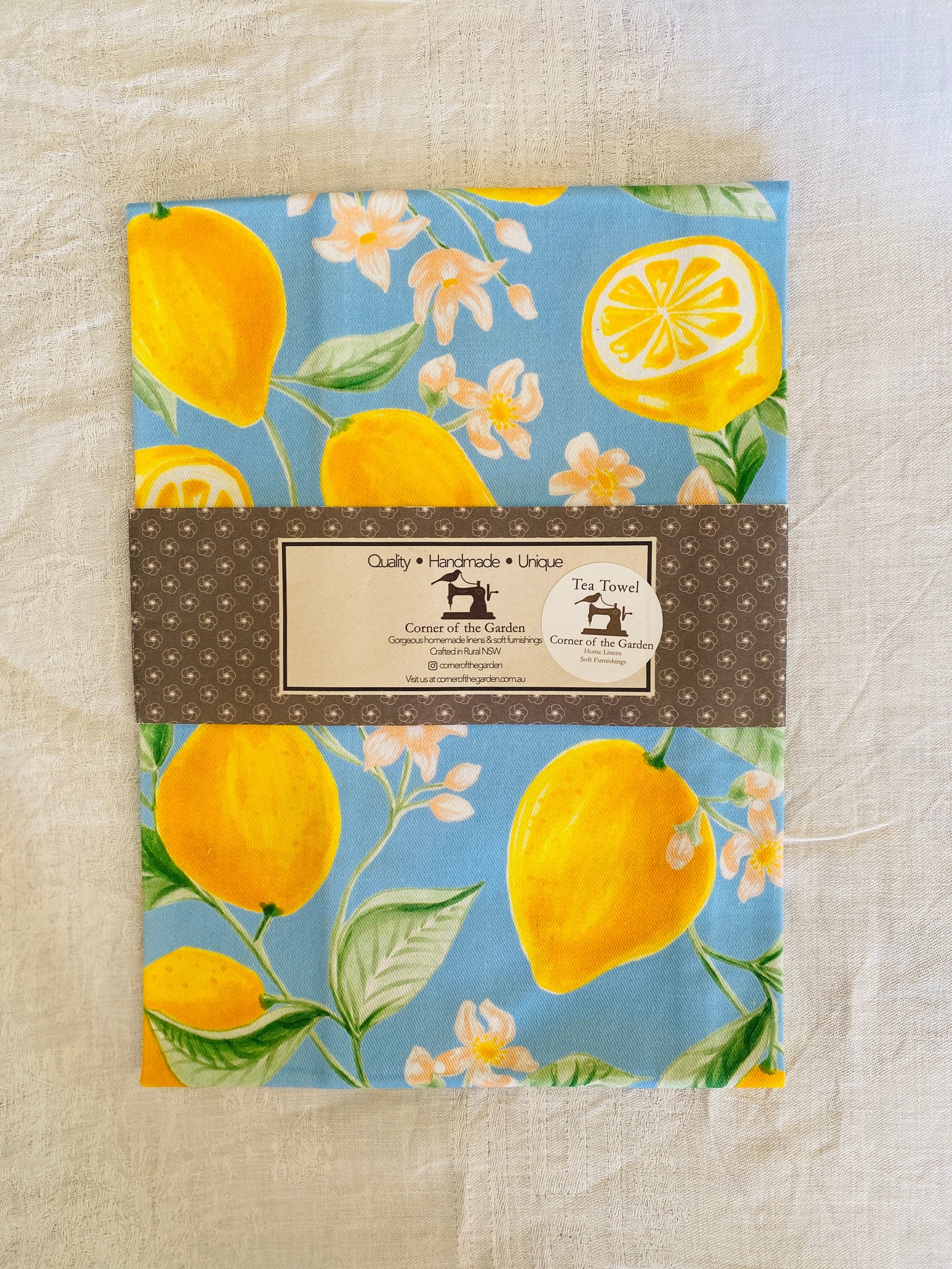 A gorgeous vibrant print of Lemons in blues greens and yellows. Makes a beautiful Tea Towel.