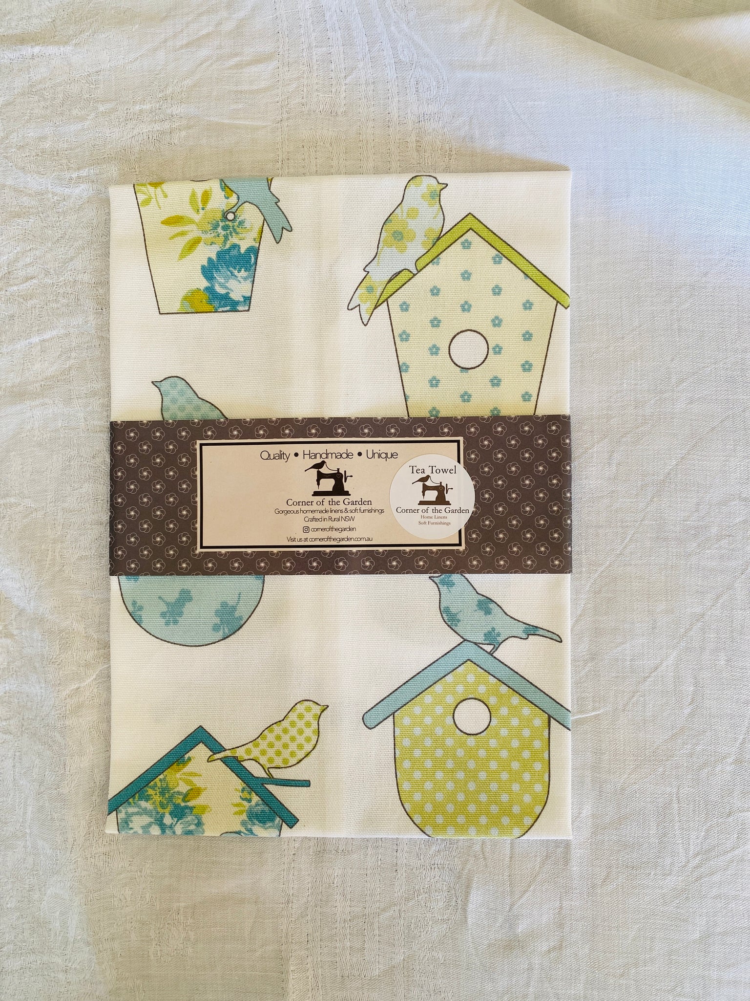 A fun print of Birds in pale blues and greens on a white background with Bird Houses . Makes a beautiful Tea Towel.
