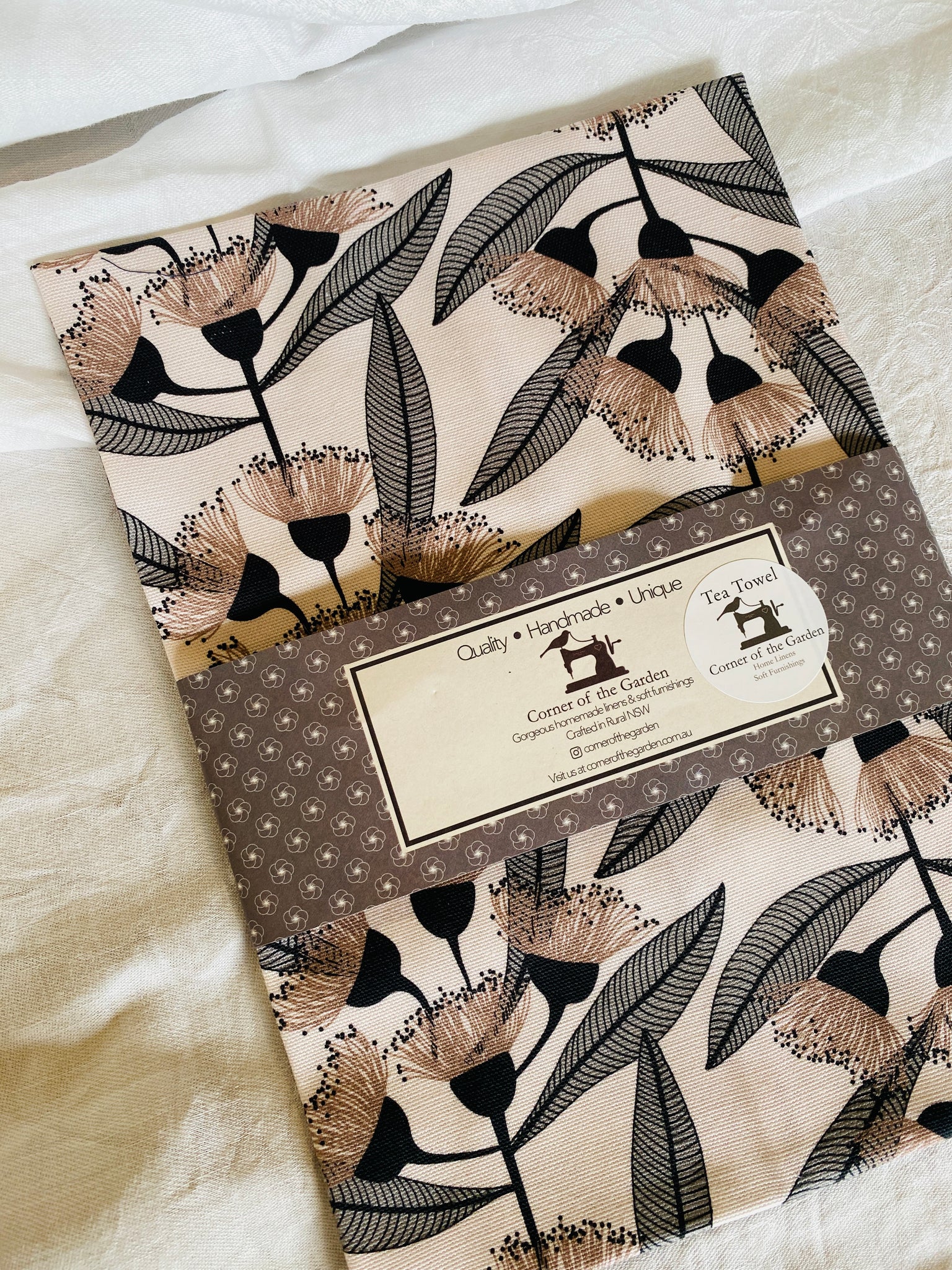 A stunning print of our gorgeous Eucalyptus in Black and Taupe on a white background. Makes a beautiful Tea Towel.
